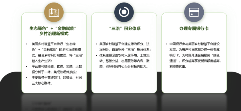 美麗鄉村智慧平臺管理系統將“生態綠色”+“金融賦能”融入鄉村治理新模式,建立德治積分、法治積分、自治積分“三治”積分體系,助力鄉村振興。