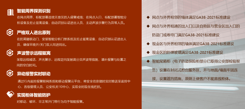 系統嚴格按照國家公共安全行業標準《銀行安全防范要求》(GA38-2021標準)要求,利用銀行現有內部業務網絡,部署智能尾箱管理系統,形成一套上下統一、功能完善的管理體系,建設一個功能完善、運轉高效、規范有序為目標,實現可視化監管、數字化尾箱管理、安全監管于一體的物聯網信息化管控平臺,確保尾箱儲存、保管的絕對安全。