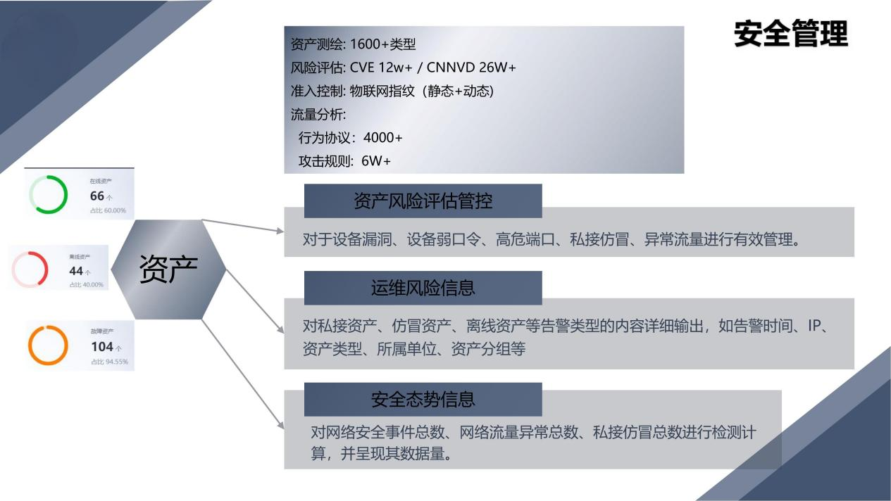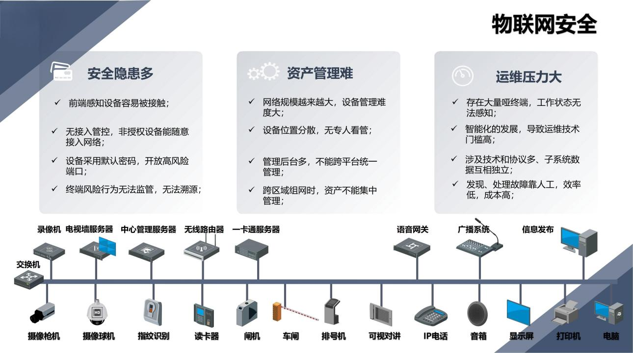 物聯網安全準入管控及運維預警系統,綜合運用資產識別、安全準入授權、非法行為識別及攔截、視頻智能分析及網絡AI智能運維等技術,為物聯網建立一套安全可控、智能運維、資產集中管理的綜合應用平臺,做到“設備可知、入網可信、行為可控、狀態可視、故障可查”,確保安防網安全、穩定、可靠的運行。